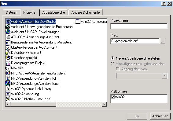 In einem Arbeitsbereich (workspace) können sie mehrere Projekte verwalten. Ein Arbeitsbereich entspricht etwa einem Schubladenschrank, dessen Schubladen die Projekte sind. In der IDE von VC++ kann immer nur ein Arbeitsbereich verwaltet werden.