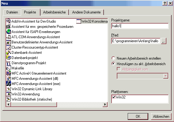 Als Anwendung kommt nur eine Win32-Konsolenanwendung in Frage, weil alles andere an dieser Stelle viel mehr Wissen erfordert, als Sie zur Zeit mitbringen. Sie wählen also die Win32-Konsolenanwendung aus!