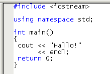 Das Bild oben zeigt das erste C++-Programm. Es gibt in einer Zeile den Text "Hallo!" aus.