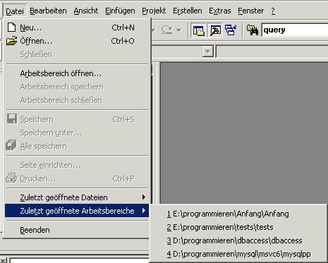 dann ist es komfortabler folgenden Weg zu beschreiten (s. Abb. rechts): Sobald Sie diesen Menüpunkt erreichen, öffnet sich ein Untermenü, welches ihre letzten vier geänderten Arbeitsbereiche zur Auswahl anbietet. Nun, Sie haben erst einen Arbeitsbereich bearbeitet, also kann auch nur einer angeboten werden. Nun brauchen Sie nur noch den gewünschten Arbeitsbereich im Menü zu aktivieren. Darauf hin lädt die IDE die dazugehörenden Dateien. |