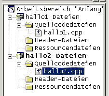 Um das zweite Programm zu erstellen, sollen Sie ein weiteres Projekt "hallo2" dem geöffneten Arbeitsbereich hinzufügen. Sie sollten inzwischen wissen wie das geht. Achten Sie darauf das Projekt als eine Win32-Konsolenanwendung anzulegen. Vergessen Sie nicht dem Projekt eine entsprechende C++-Quellcodedatei hinzuzufügen. Wenn Sie dies alles erledigt haben, können Sie in der Projektverwaltung die abgebildete Struktur finden. Darin ist das Projekt hallo2 in fetter Schrift dargestellt. Das so dargestellte Projekt ist immer das aktuelle und nur dieses aktuelle Projekt können Sie komplett übersetzen und linken lassen. |